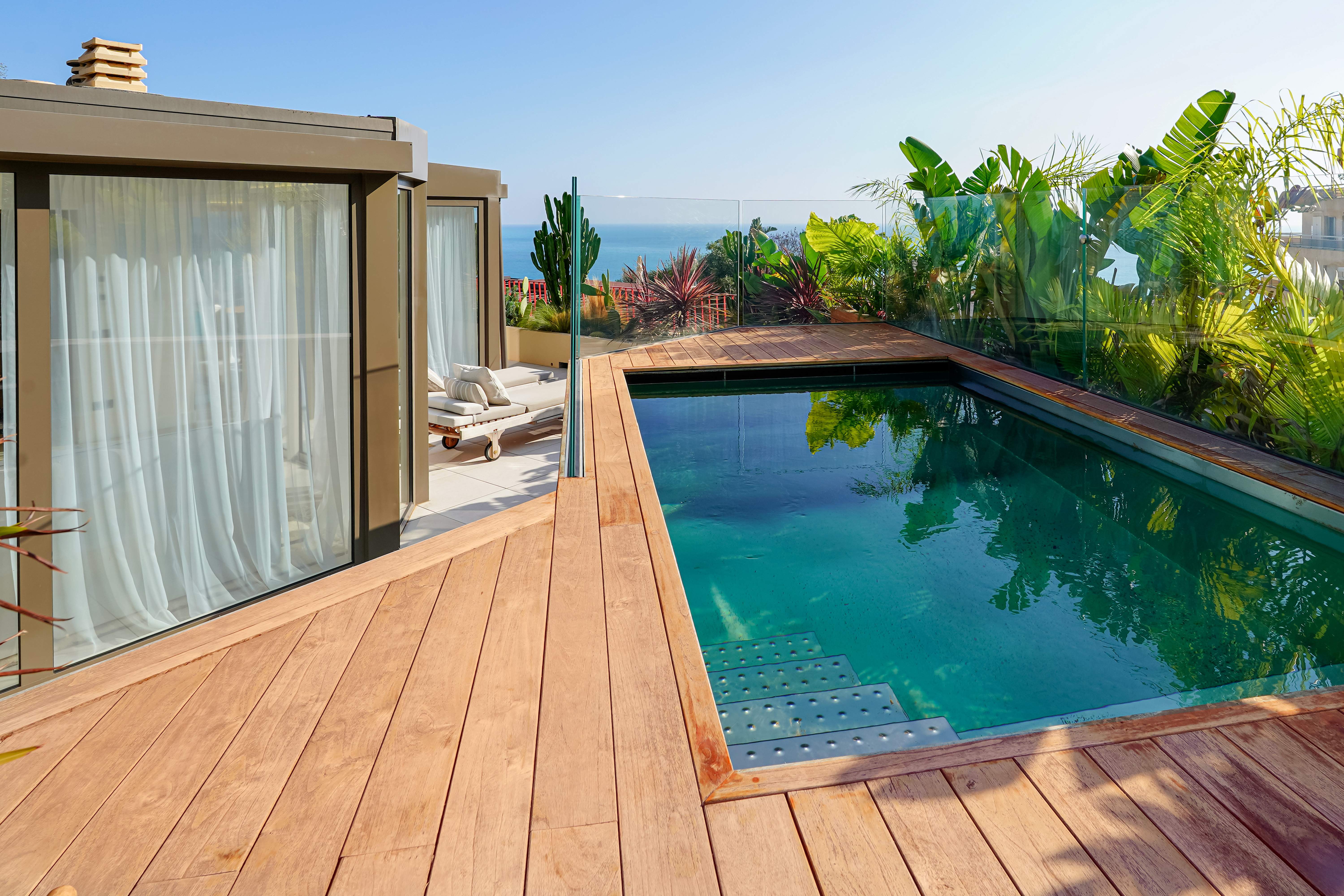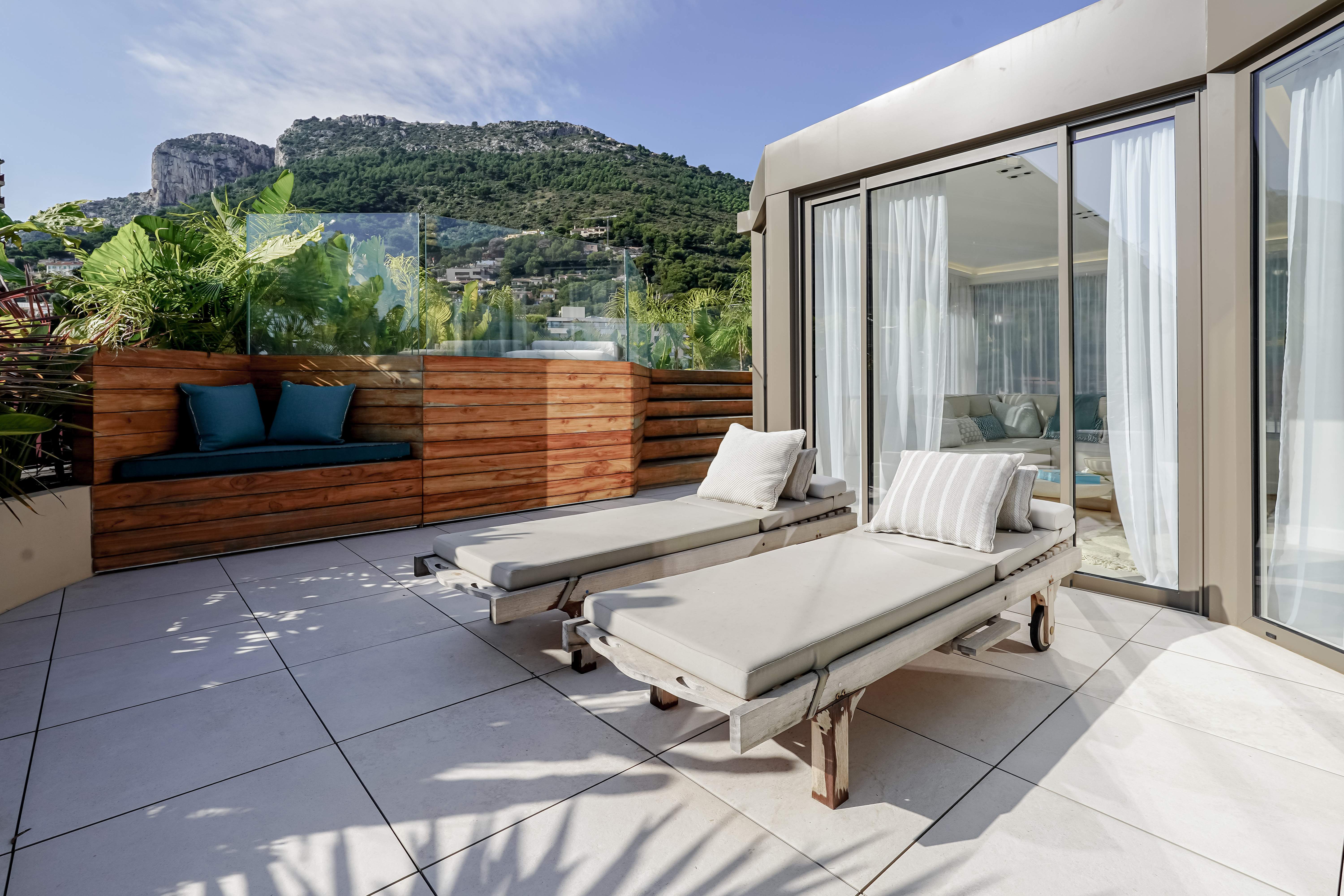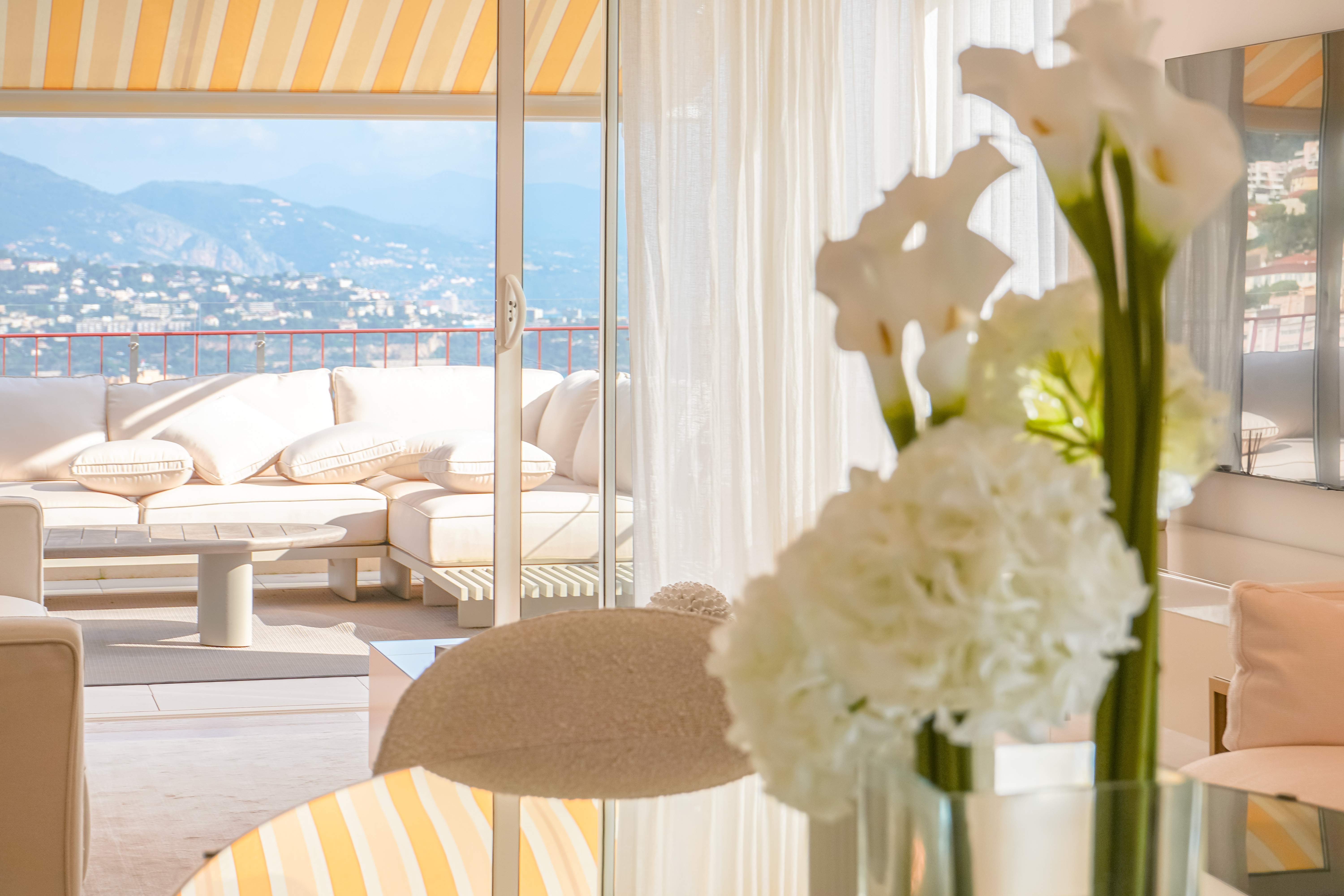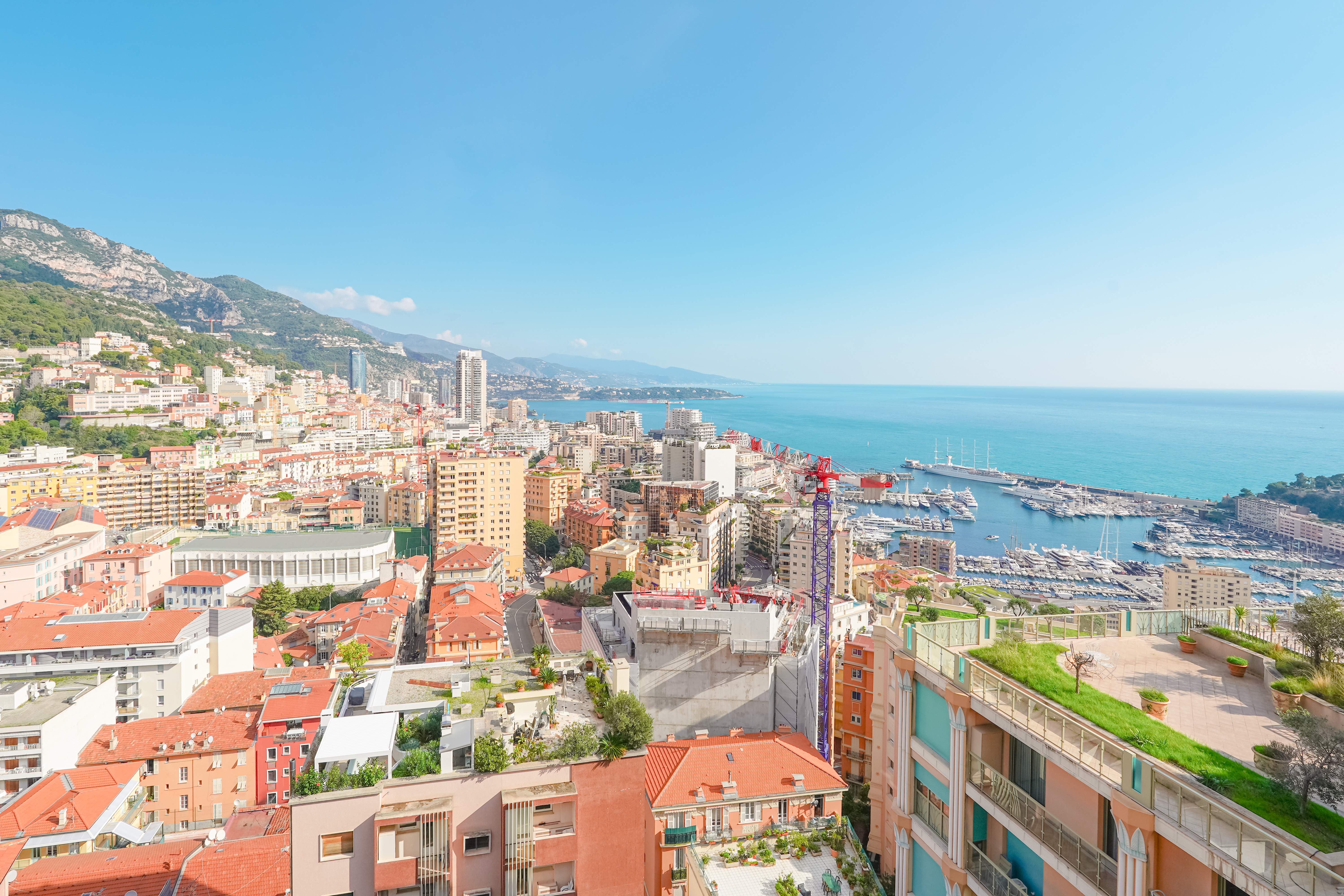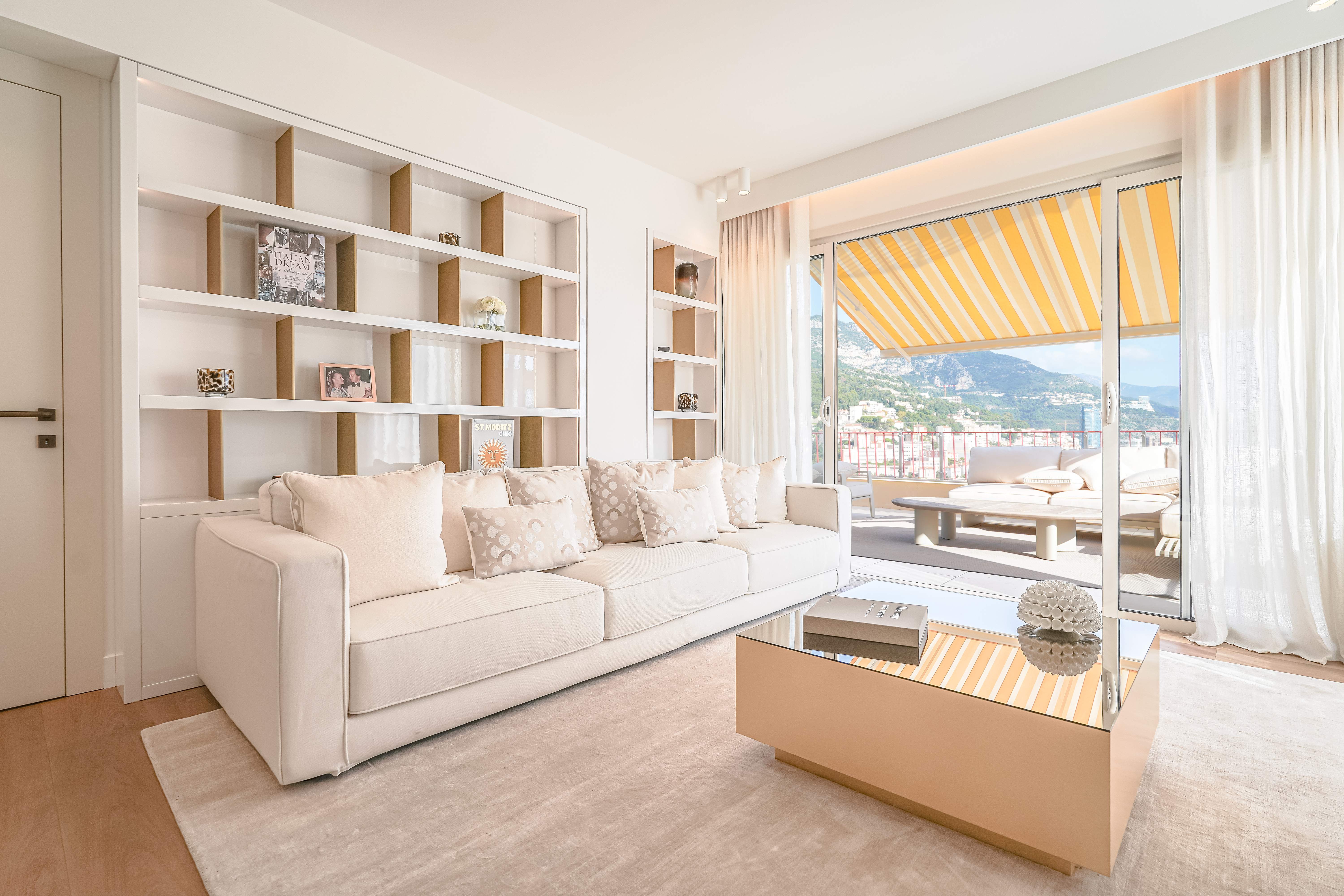 Located in the Jardin Exotique district, in a residence close to numerous amenities including local shops (pharmacy, supermarket, hairdresser, etc.), schools and parks. Magnificent duplex penthouse with direct lift to the flat. This property has been luxuriously renovated and furnished to a very high standard and refined materials. Thanks to its position on the top floor and the fact that the residence is on the heights of the Principality, the flat enjoys panoramic views over the sea and Monaco. On the first floor, the flat comprises an entrance hall with guest toilet, 4 bedrooms with dressing rooms and bathrooms. A fully equipped kitchen with central island in marble opens onto the living room. There is a large, unoverlooked terrace facing Monaco and the sea. A staircase leads to the upp...