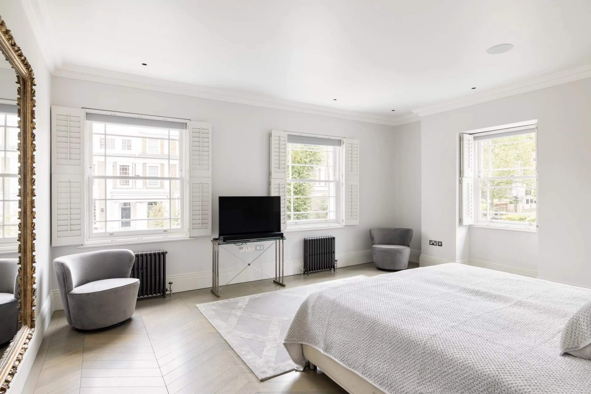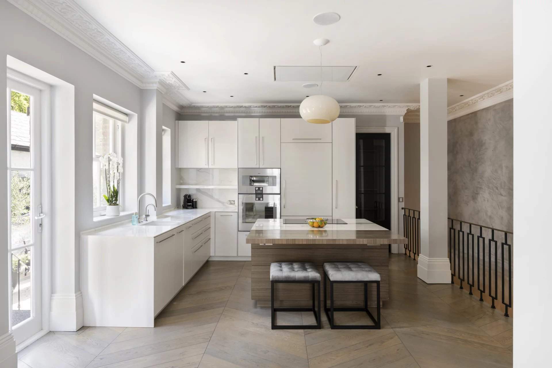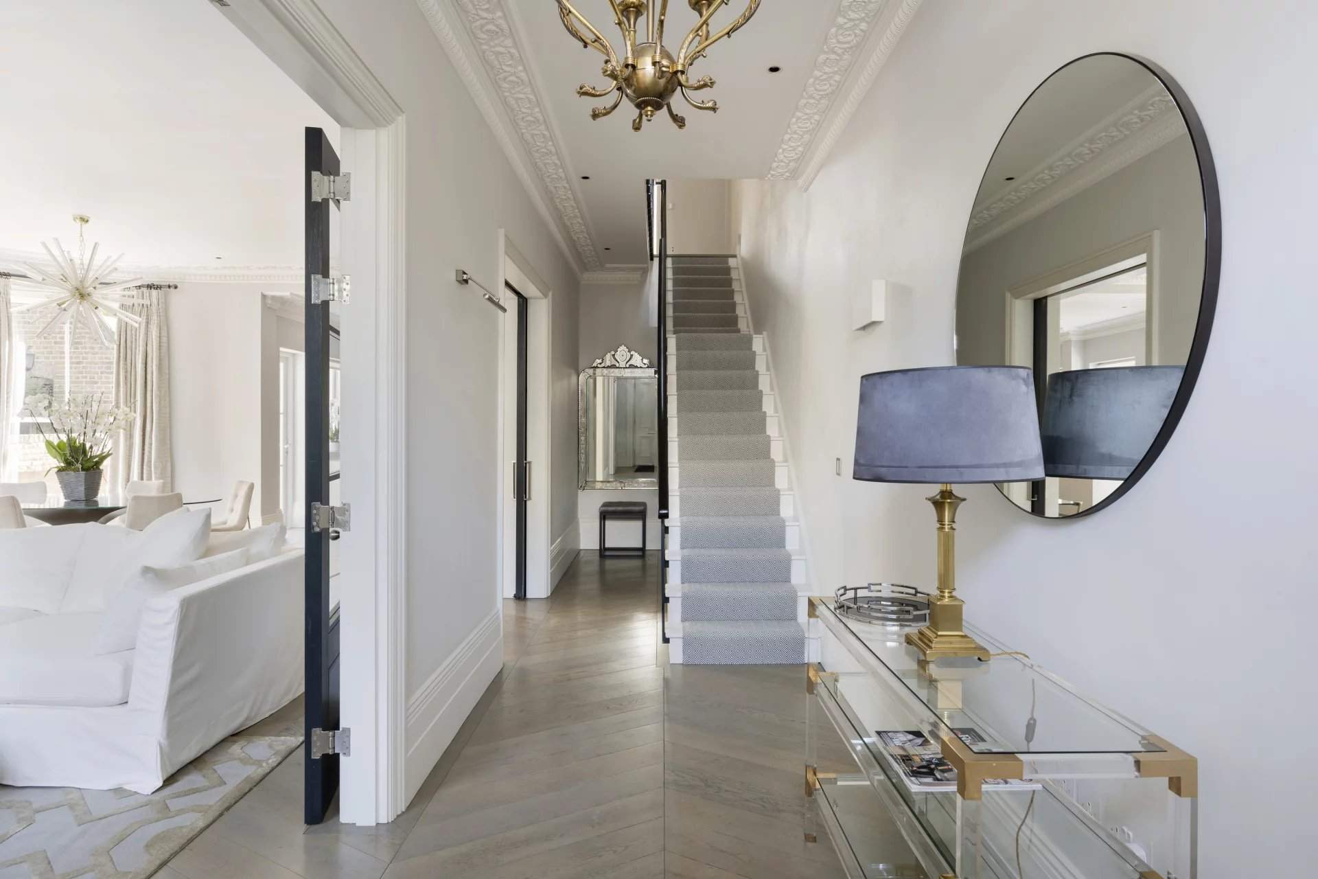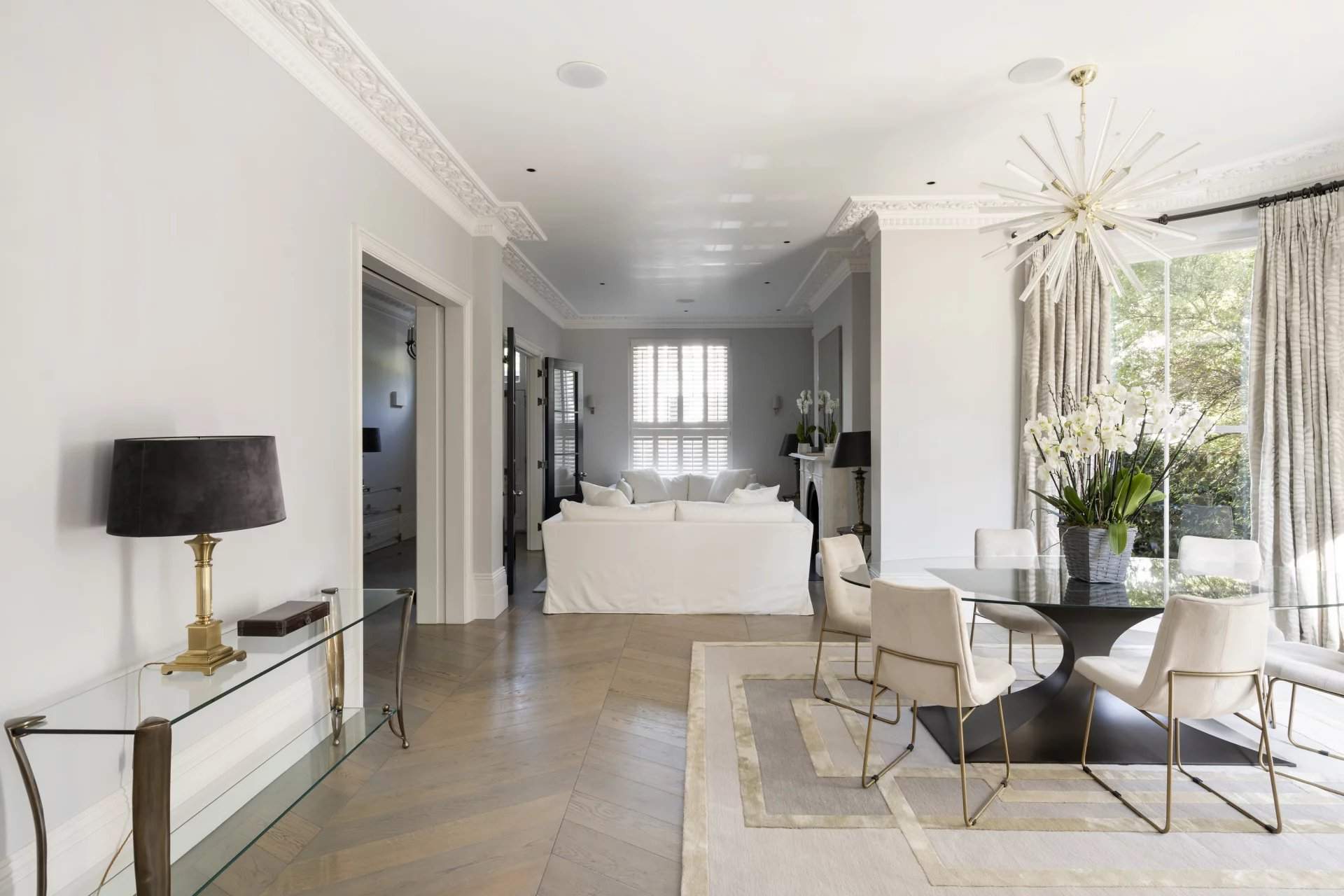 Expansive period proportions have been reimagined for modern living in this sophisticated six-bedroom family home for sale. Nestled within a walled plot on Ladbroke Road, the property is both elegant and private, with ornate plasterwork columns and a gated entrance adding a refined touch to its exterior. Inside, the home's classic design blends seamlessly with contemporary updates to suit family life. The ground floor is dedicated to open-plan kitchen, reception and dining spaces, creating a fluid and inviting environment. A fireplace anchors the formal seating area, while a curved wall and ornate ceiling add character to the dining section. The kitchen, with sleek cabinetry, integrated appliances, and a custom stone island, leads into a low-maintenance courtyard garden. Below ground, addi...