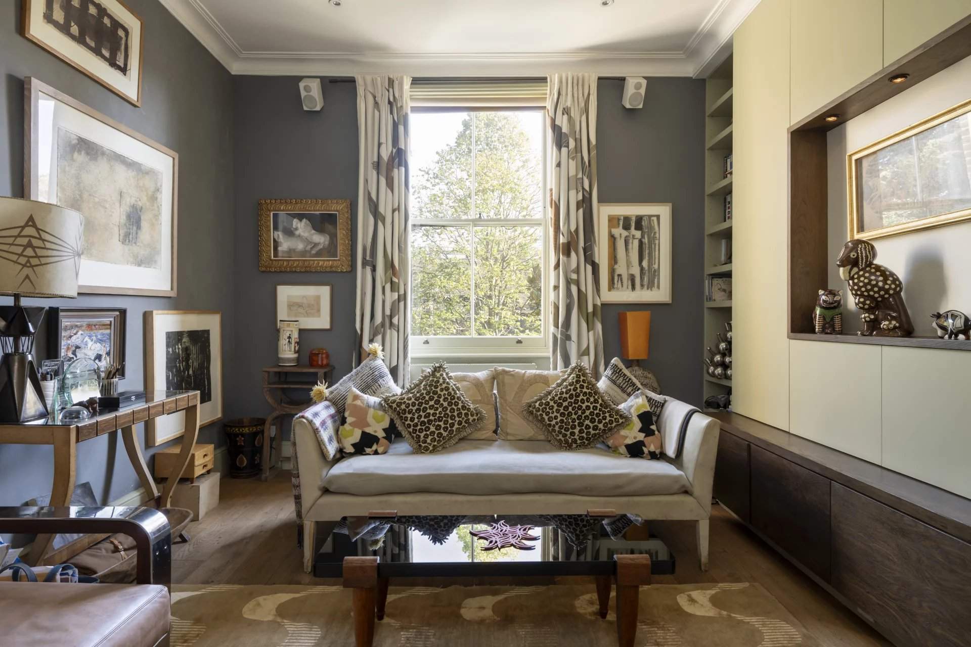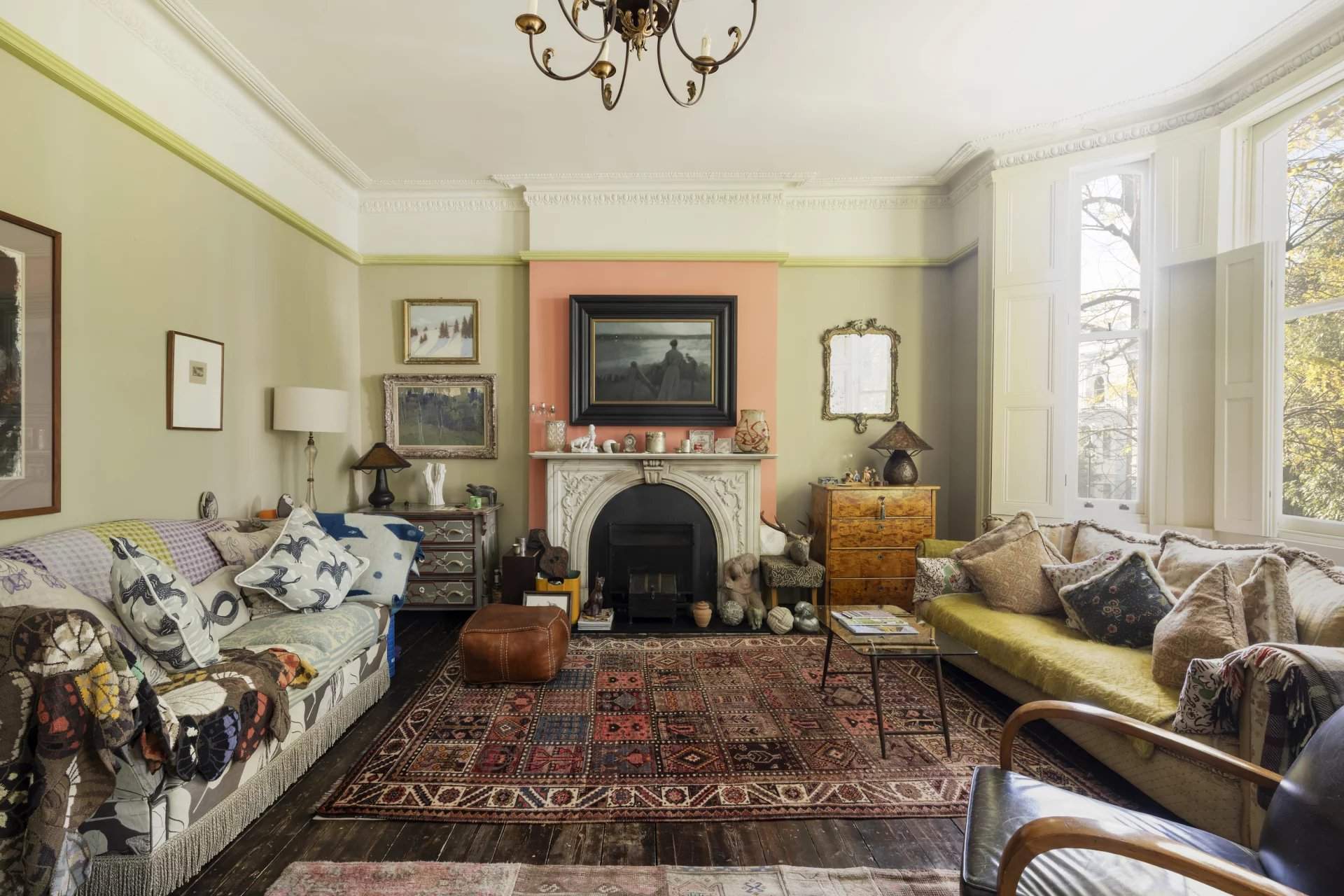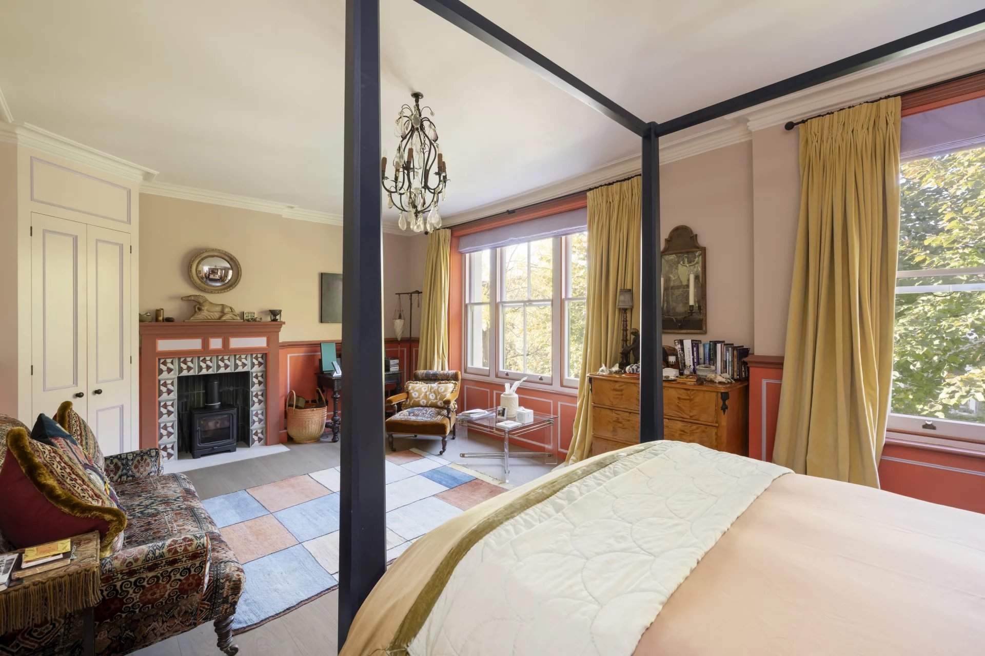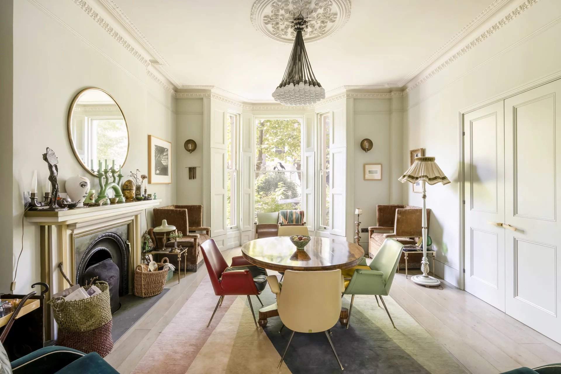 This five-bedroom Notting Hill house blends period charm with modern design across five character-filled floors. Nestled on a peaceful street, the property boasts a grand entrance with original features like soaring ceilings, intricate cornicing and a cast iron fireplace. The open-plan living area flows into a unique kitchen with a repurposed chemistry bench countertop, copper sink and aged brass accents. Glass doors lead to a private balcony, offering views of a landscaped garden with a koi pond, mature trees and a shed by The Real Shed Company, ideal for creative work or storage. The garden level features a contemporary kitchen and living space designed by architect Ian Hay, with sleek amenities, bespoke Lutron lighting and underfloor heating. The first floor offers versatile reception r...