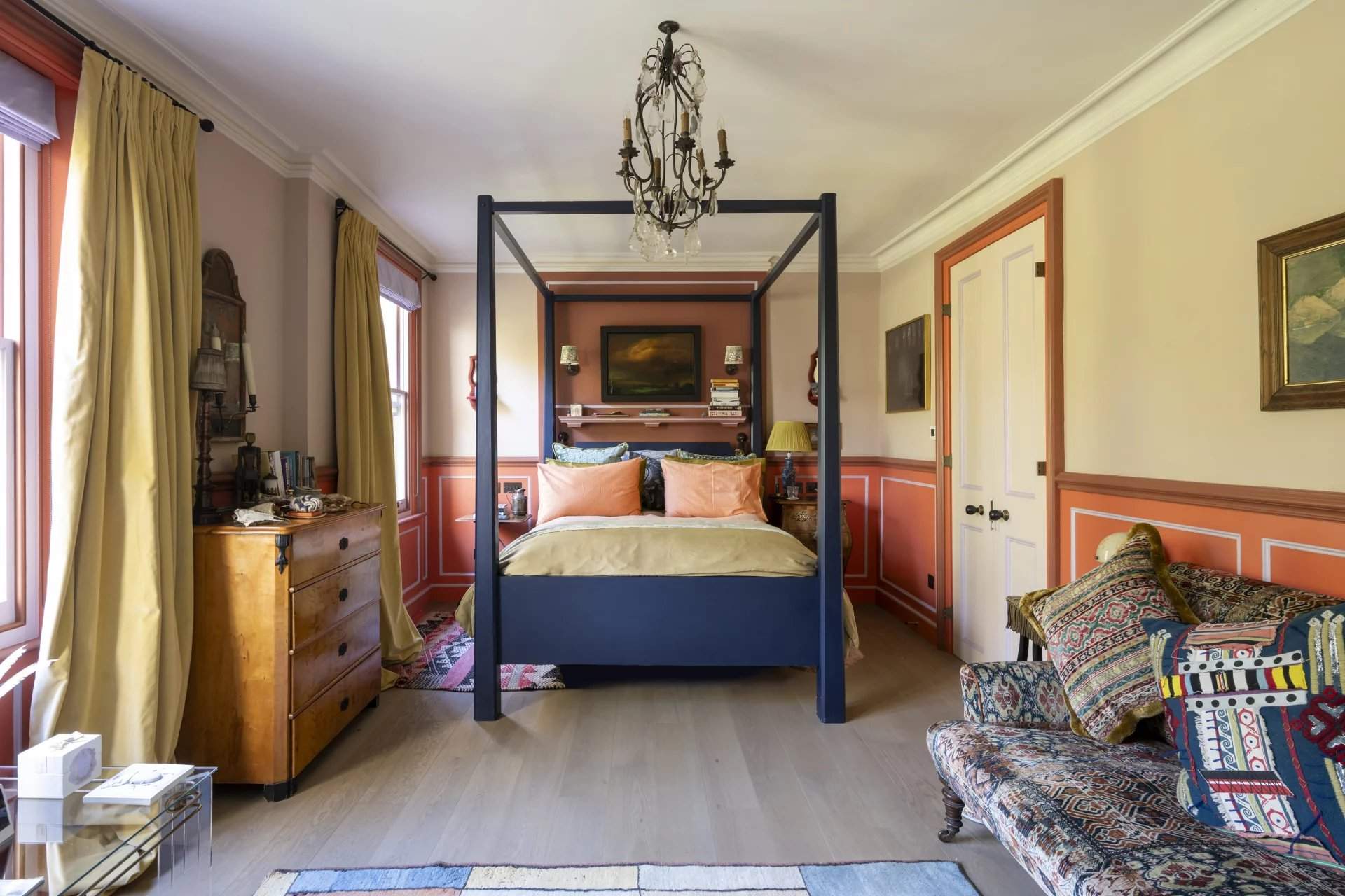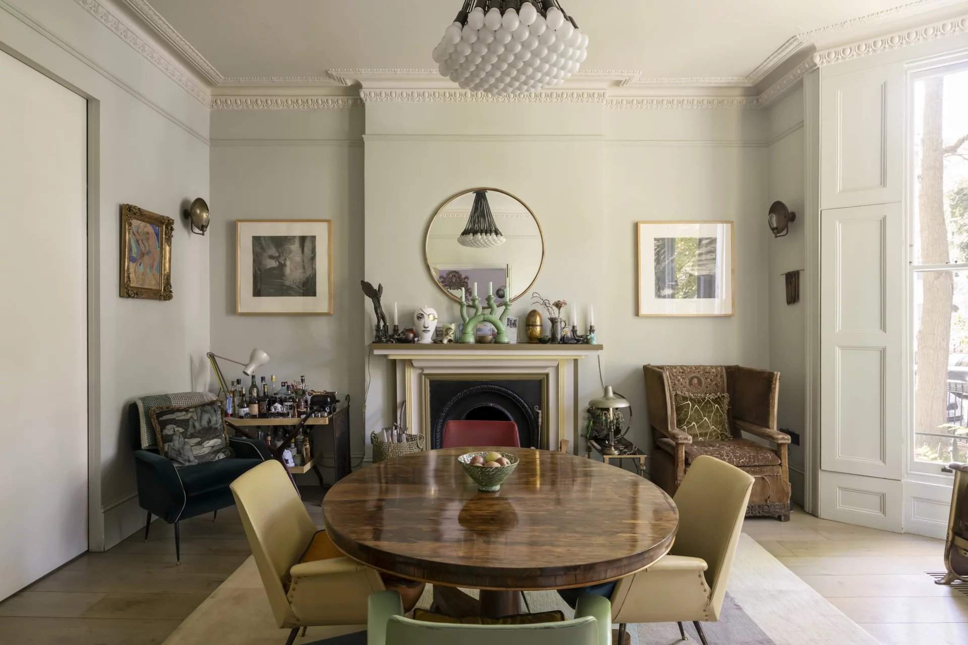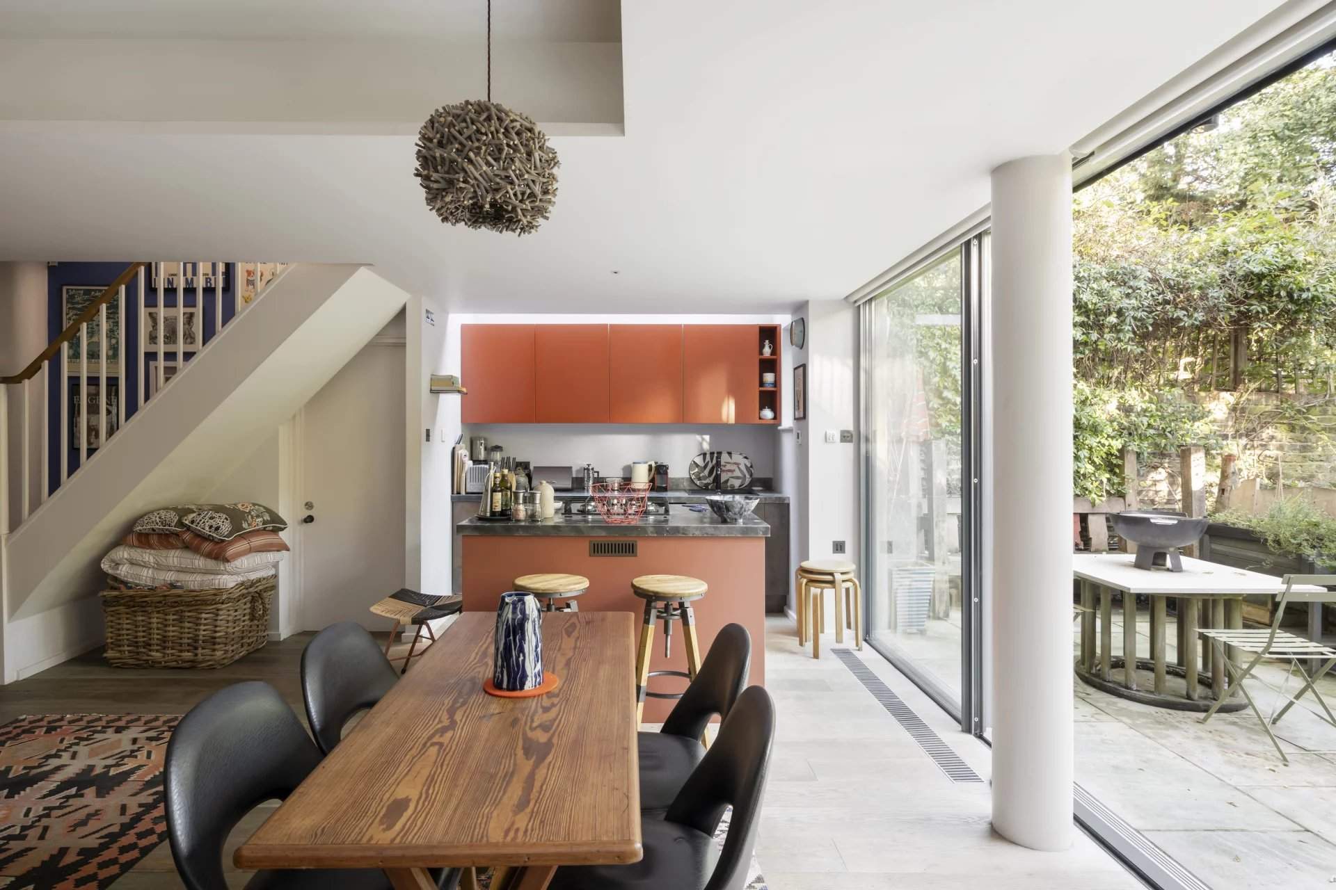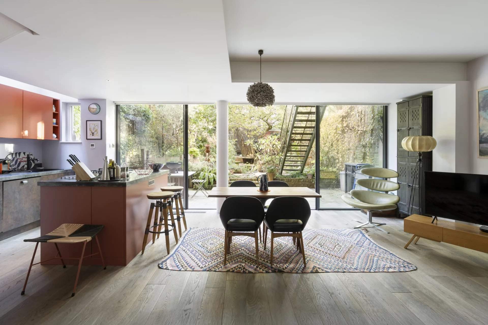 This five-bedroom Notting Hill house blends period charm with modern design across five character-filled floors. Nestled on a peaceful street, the property boasts a grand entrance with original features like soaring ceilings, intricate cornicing and a cast iron fireplace. The open-plan living area flows into a unique kitchen with a repurposed chemistry bench countertop, copper sink and aged brass accents. Glass doors lead to a private balcony, offering views of a landscaped garden with a koi pond, mature trees and a shed by The Real Shed Company, ideal for creative work or storage. The garden level features a contemporary kitchen and living space designed by architect Ian Hay, with sleek amenities, bespoke Lutron lighting and underfloor heating. The first floor offers versatile reception r...
