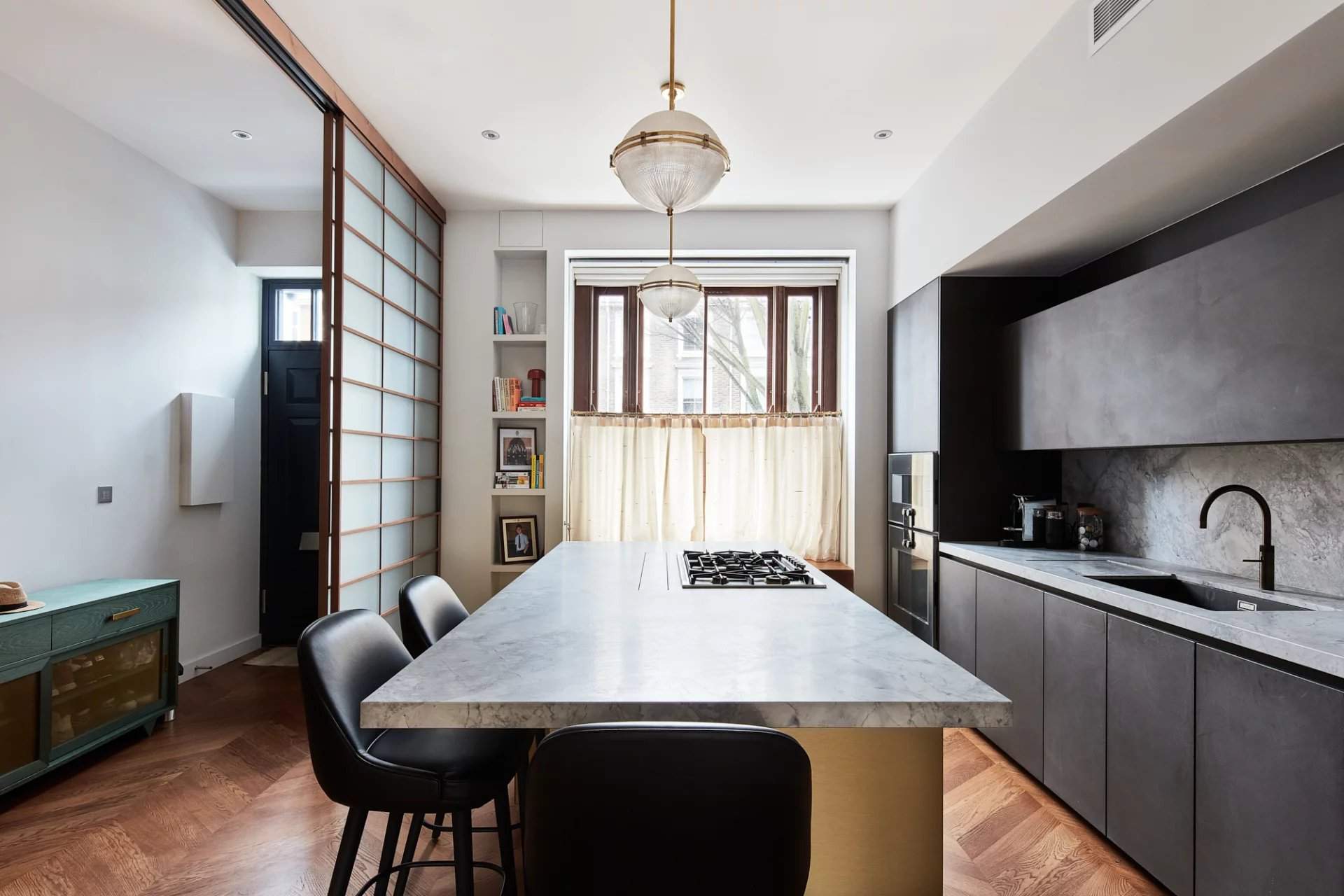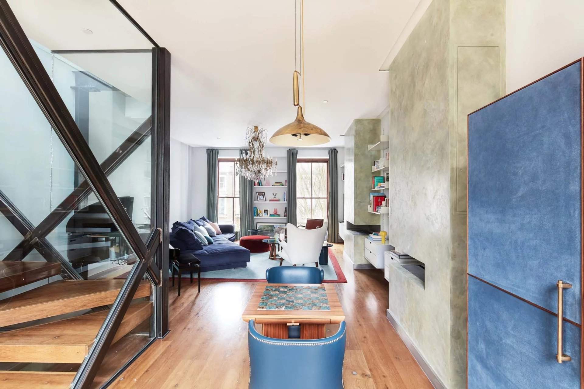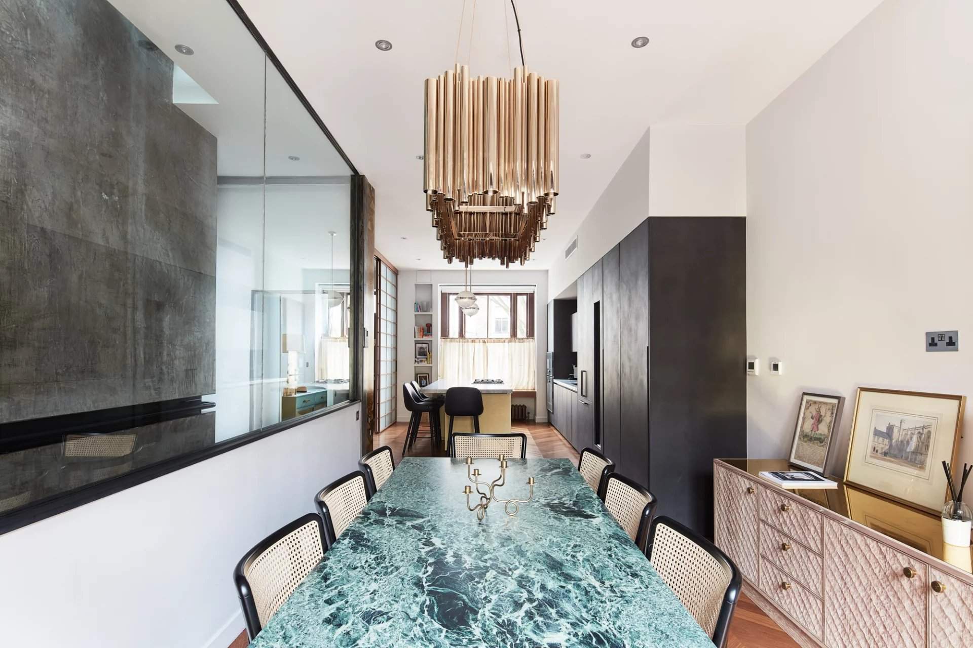 This four-bedroom townhouse within the Ladbroke Conservation Area, designed by CUBIC Studios, has a strong sense of identity. Moments from Kensington Temple Church and a selection of artisanal shops, this distinguished home draws together an unrestrained palette of materials. The open-plan kitchen and dining room, accessed through a sliding screen, showcases a gold-topped island with grey stone, and Gaggenau appliances integrated into minimalistic charcoal cabinetry. Pendant lights illuminate the breakfast bar while chevron flooring leads into the dining area, which has views out to the decked terrace. The home features playful accents and industrial elements including reclaimed theatre doors and a striking gold wall with Aztec detailing. The first-floor reception room is bathed in natural...