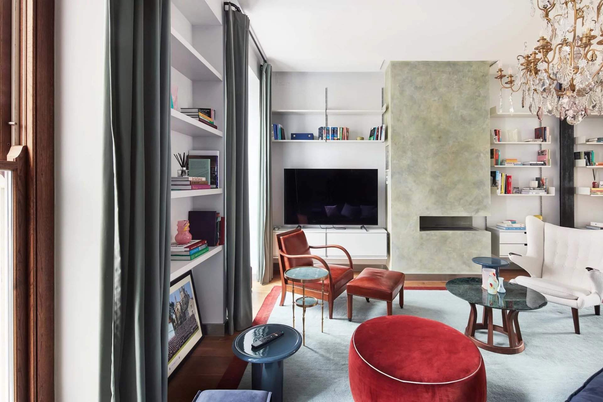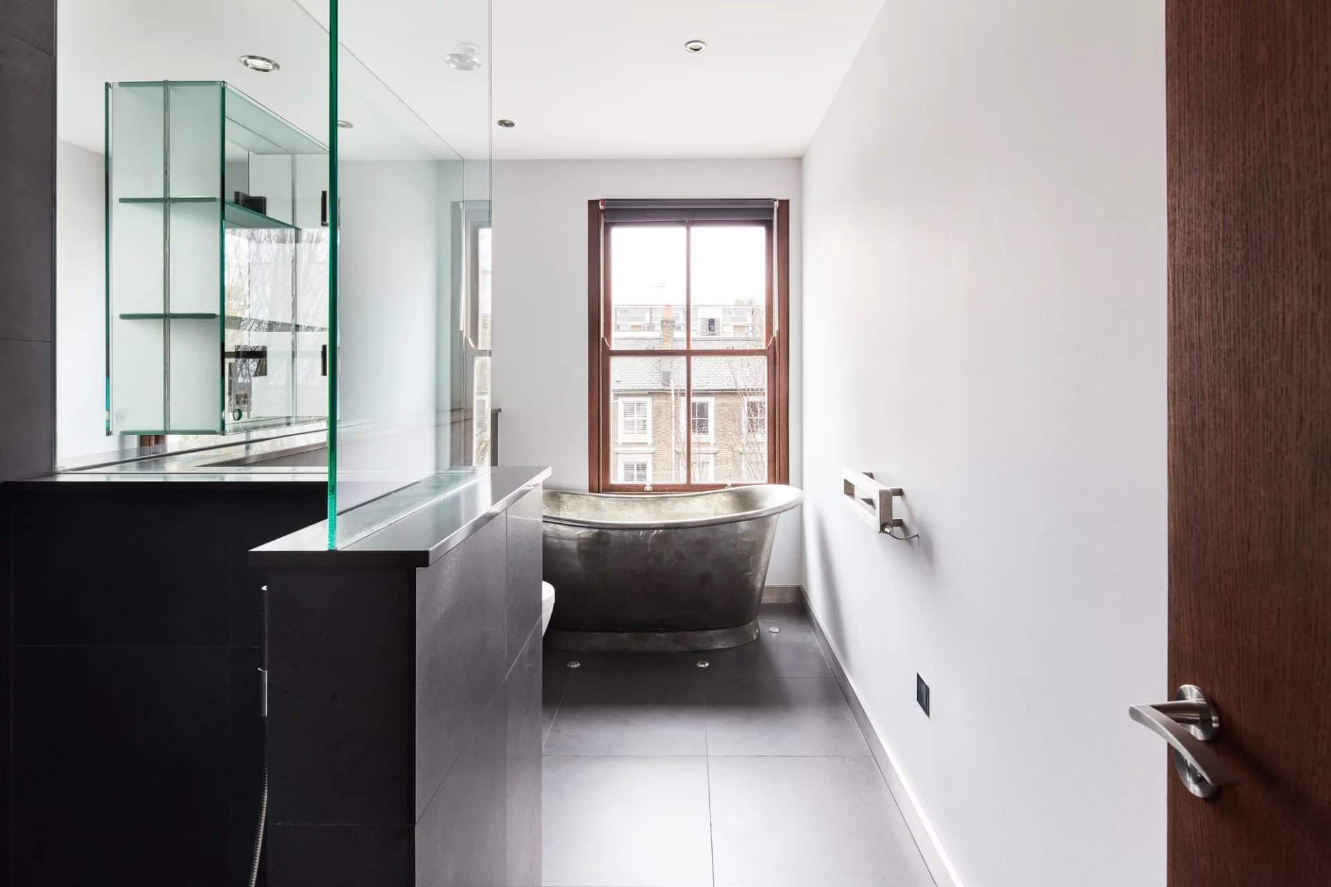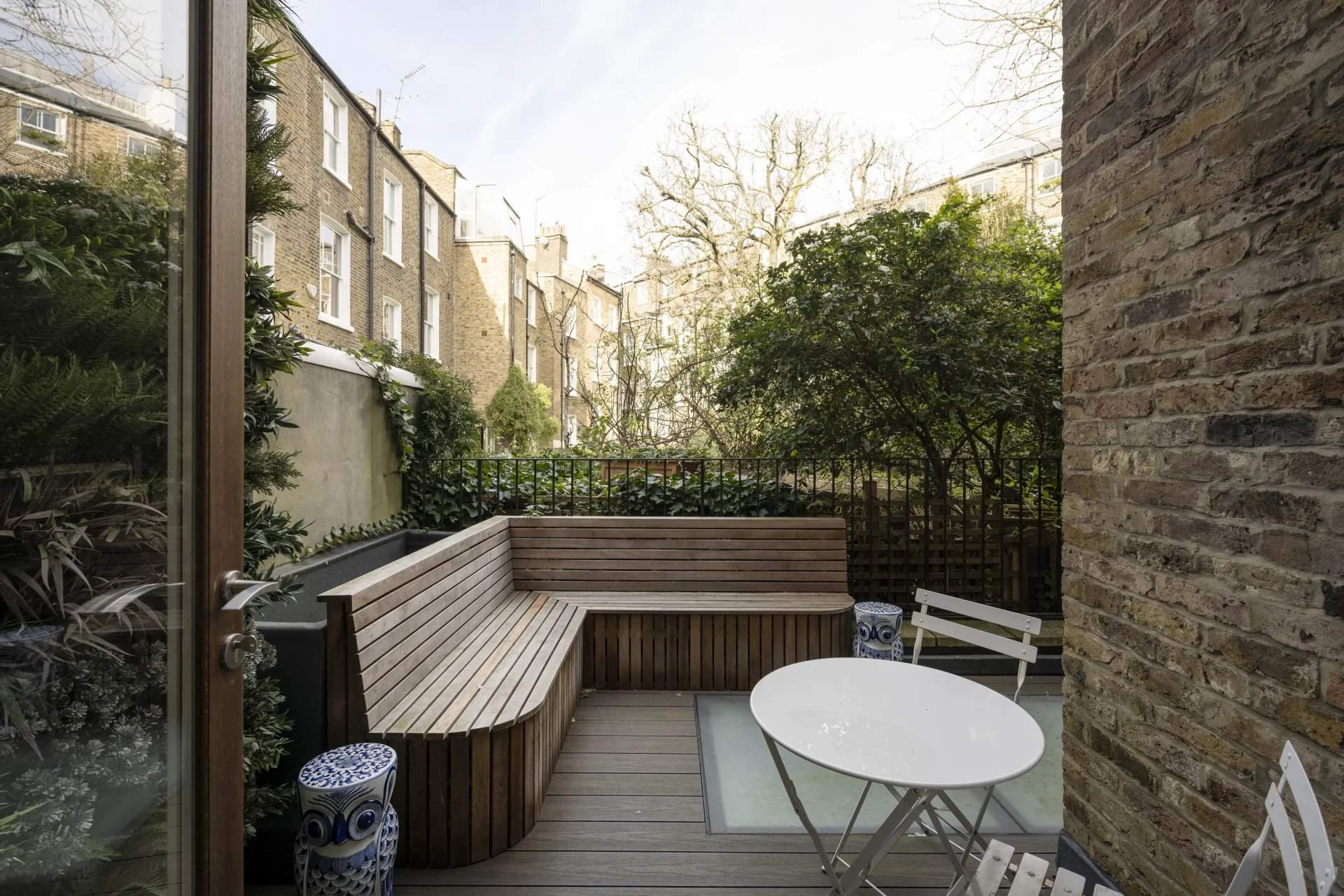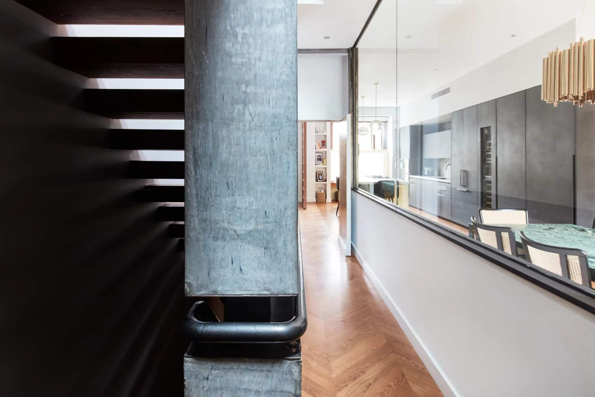 This four-bedroom townhouse within the Ladbroke Conservation Area, designed by CUBIC Studios, has a strong sense of identity. Moments from Kensington Temple Church and a selection of artisanal shops, this distinguished home draws together an unrestrained palette of materials. The open-plan kitchen and dining room, accessed through a sliding screen, showcases a gold-topped island with grey stone, and Gaggenau appliances integrated into minimalistic charcoal cabinetry. Pendant lights illuminate the breakfast bar while chevron flooring leads into the dining area, which has views out to the decked terrace. The home features playful accents and industrial elements including reclaimed theatre doors and a striking gold wall with Aztec detailing. The first-floor reception room is bathed in natural...