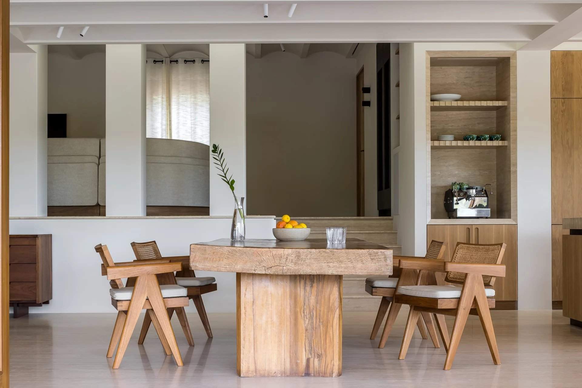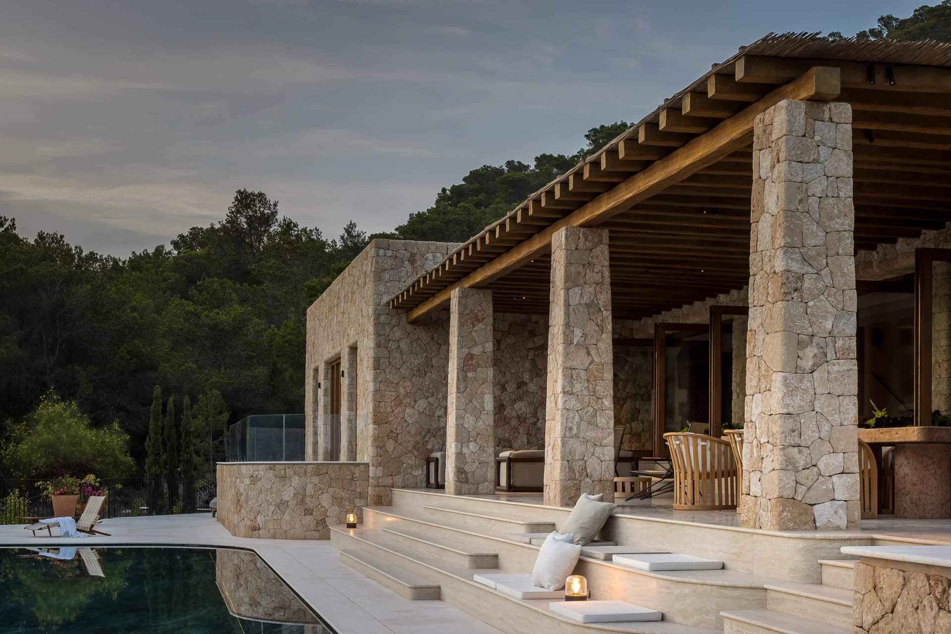 Can Brute is a secluded six-bedroom villa for sale in the hills above Cala Mastella, offering stunning sea views. Designed by Framework Studio, the villa combines traditional Ibicencan architecture with modern luxury and an off-grid energy system, providing a peaceful escape from the outside world. The villa's stone façade blends seamlessly with the landscape, leading to a serene interior of travertine floors, wood accents, and whitewashed walls. The open-plan living area is flooded with natural light, while the bespoke kitchen features marble countertops and Gaggenau appliances. Outdoor spaces include multiple terraces for relaxing or yoga, a heated swimming pool, and a sun-drenched deck perfect for enjoying sunrise views. The principal bedroom suite offers a private terrace with views of...