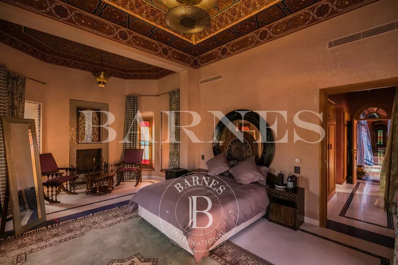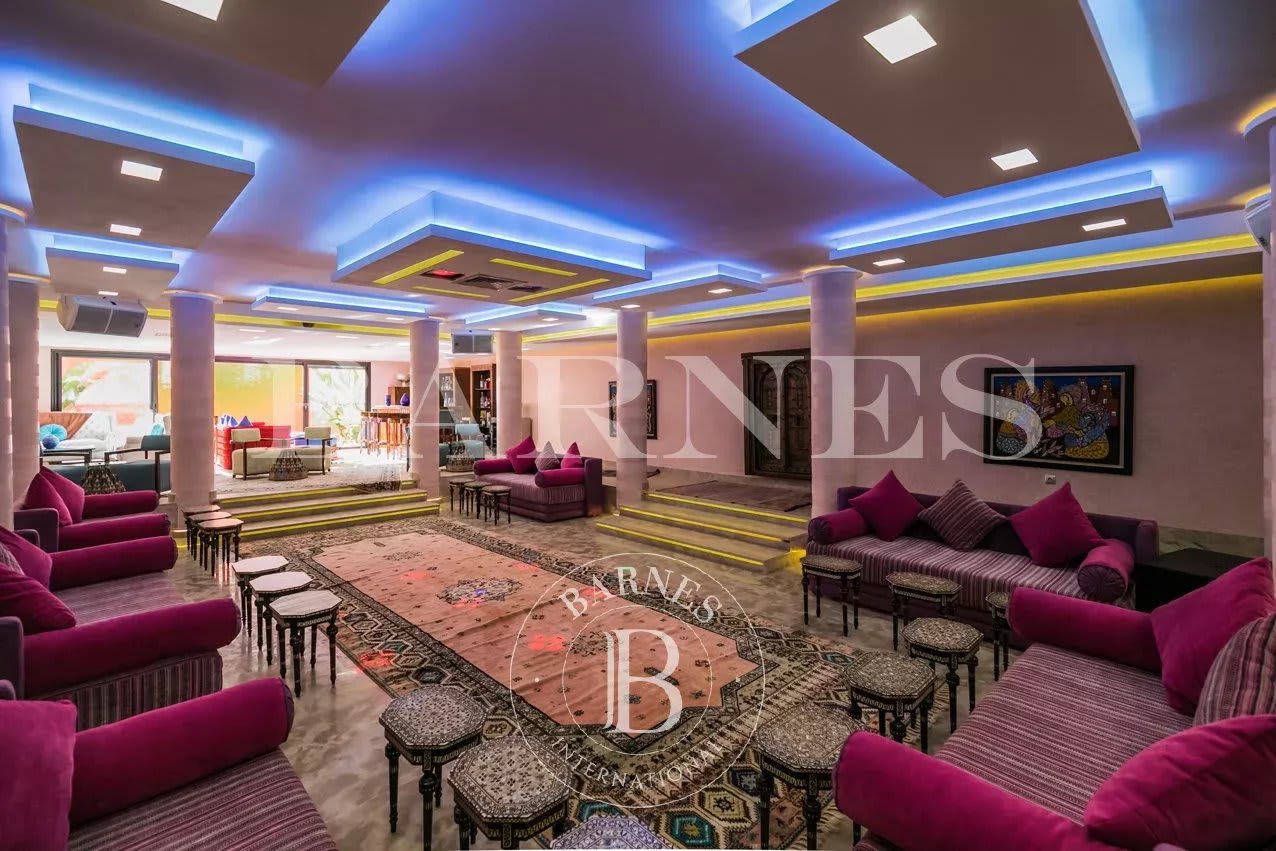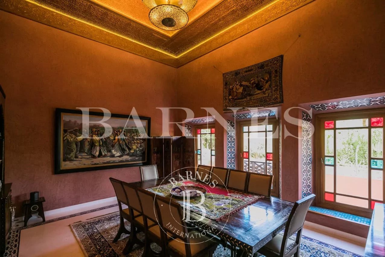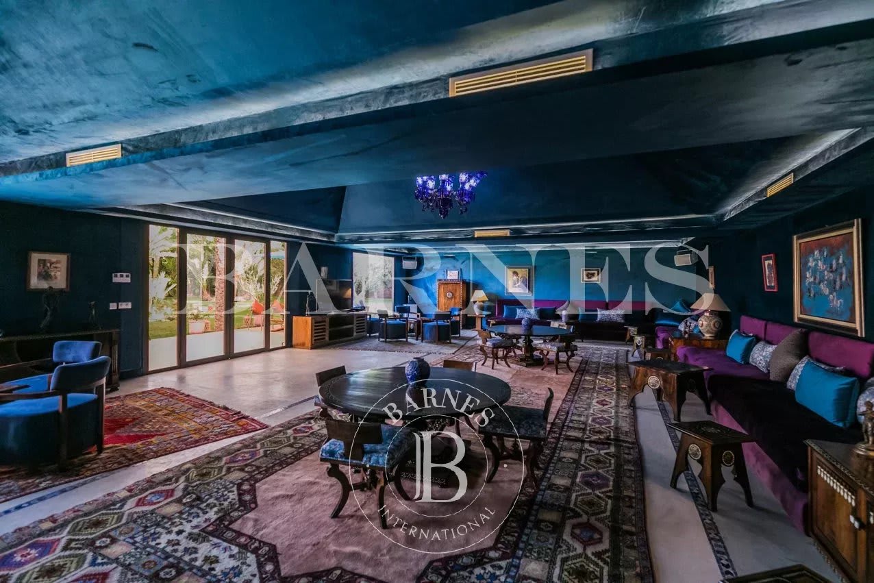 Beautiful property located in the Palmeraie, close to the city center and in a peaceful area, on a landscaped park of one hectare. It includes a main building, two guest pavilions, and a reception tent. A lovely entrance leads to several reception areas, a dining room, and two beautiful suites. The first floor has two beautiful guest suites and one master suite with numerous terraces. In the basement, there is a spa area with a massage room, a hammam, and a restroom. A large room of 200m2 can be used as a discotheque and reception room with a bar and an English courtyard. There is a large bedroom with a bathroom for the housekeeper, a beautiful equipped kitchen that opens onto a large service courtyard with two bedrooms and a living room, as well as a kitchen for the staff and a laundry ro...