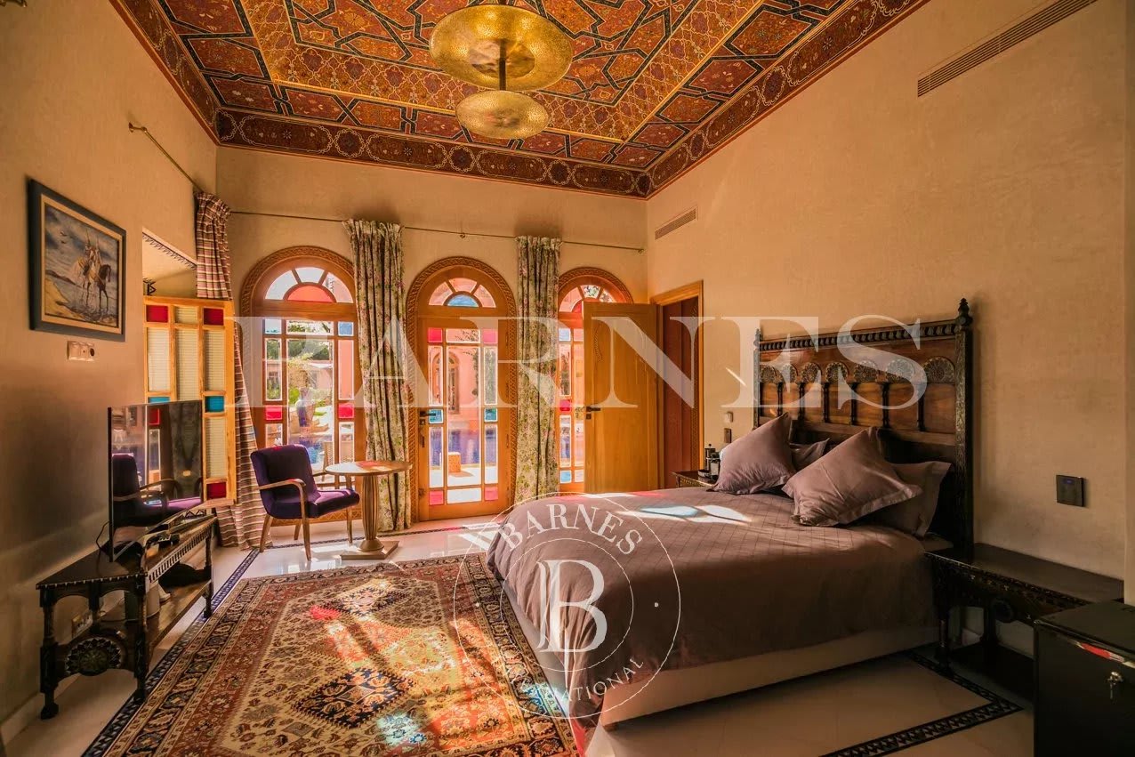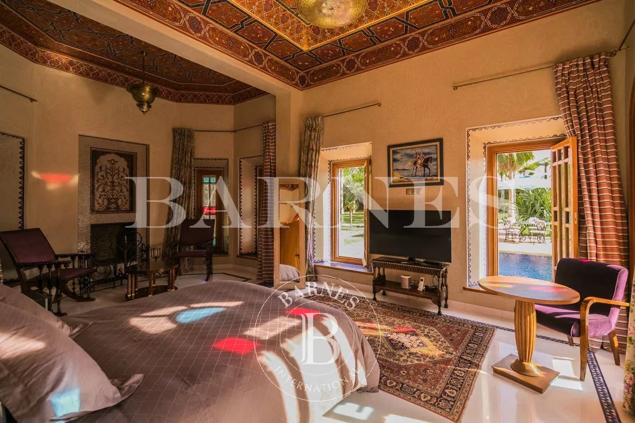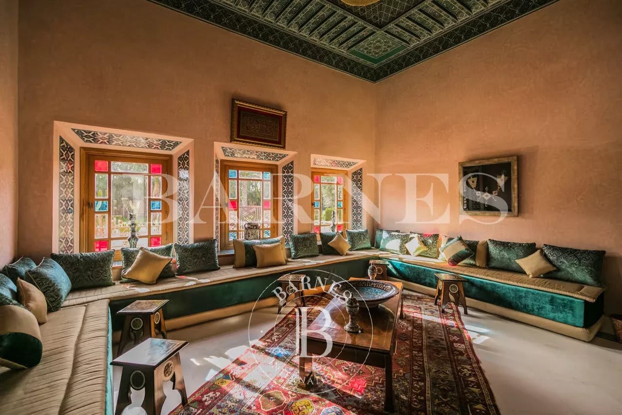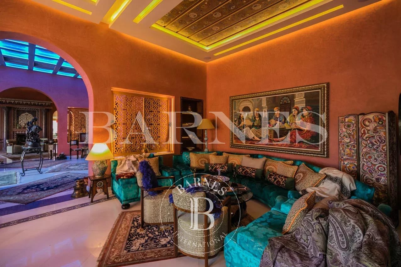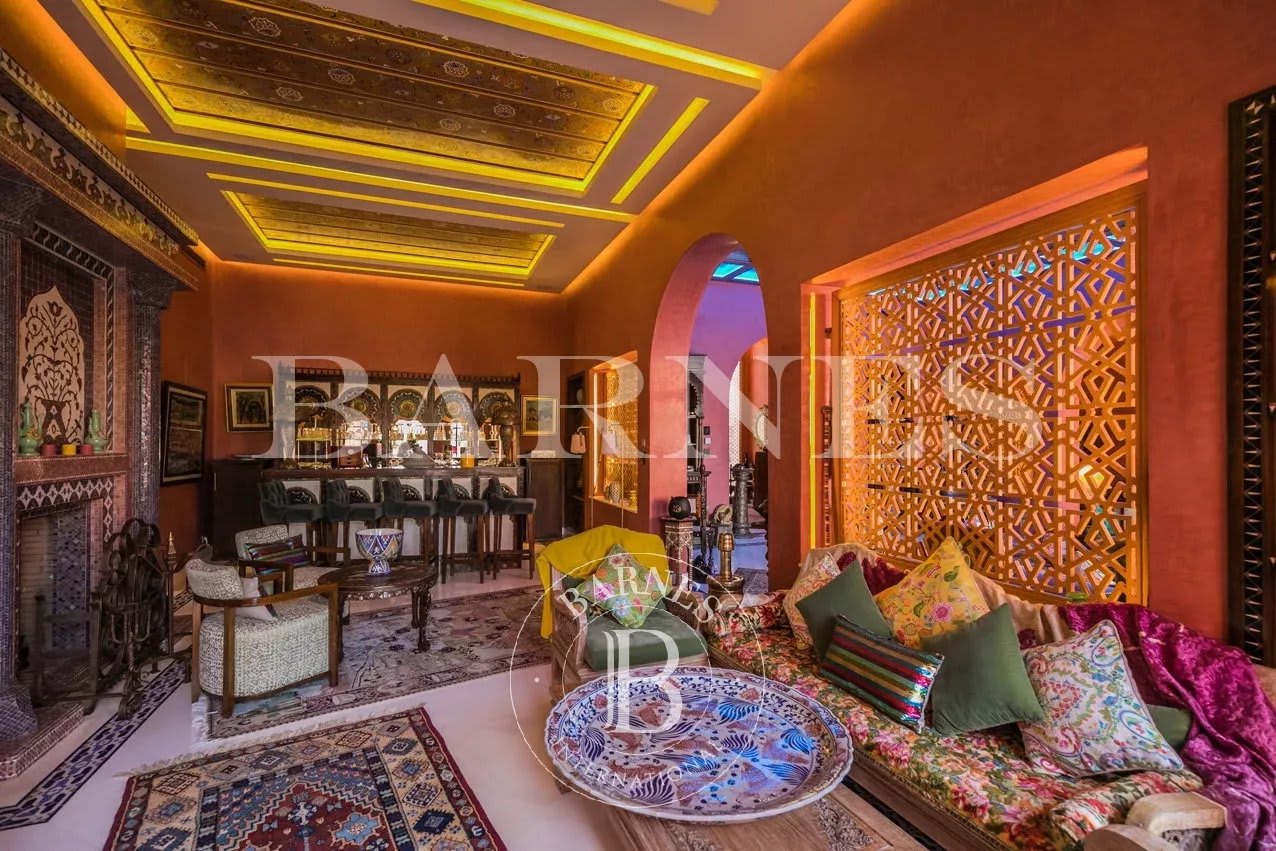 Beautiful property located in the Palmeraie, close to the city center and in a peaceful area, on a landscaped park of one hectare. It includes a main building, two guest pavilions, and a reception tent. A lovely entrance leads to several reception areas, a dining room, and two beautiful suites. The first floor has two beautiful guest suites and one master suite with numerous terraces. In the basement, there is a spa area with a massage room, a hammam, and a restroom. A large room of 200m2 can be used as a discotheque and reception room with a bar and an English courtyard. There is a large bedroom with a bathroom for the housekeeper, a beautiful equipped kitchen that opens onto a large service courtyard with two bedrooms and a living room, as well as a kitchen for the staff and a laundry ro...