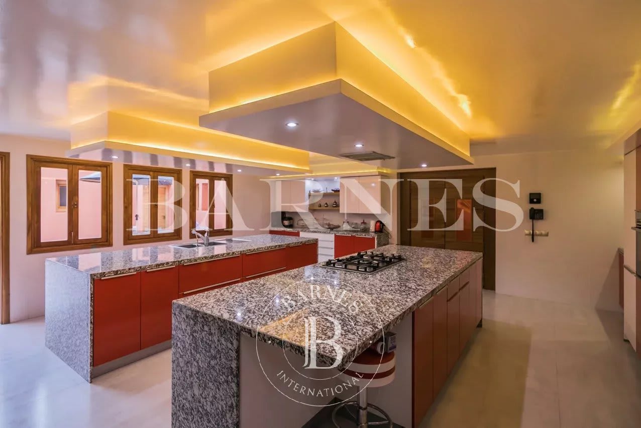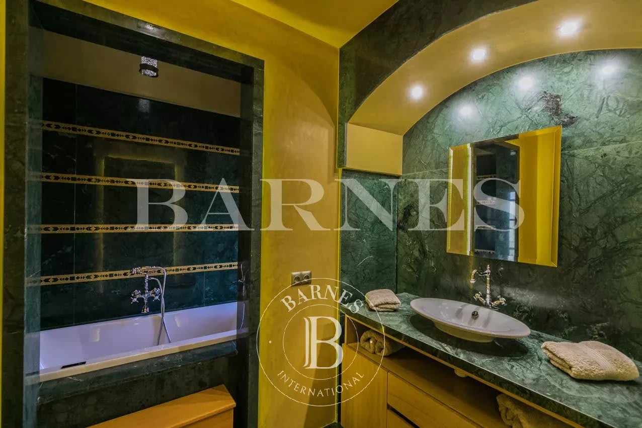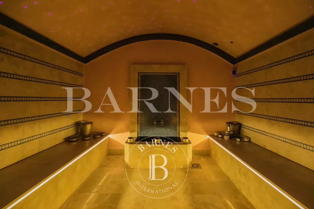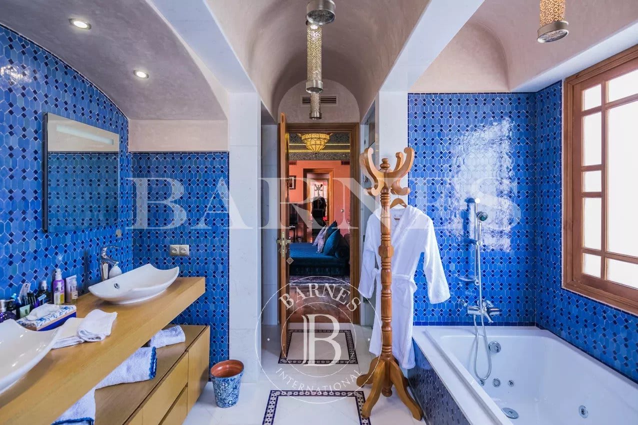 Beautiful property located in the Palmeraie, close to the city center and in a peaceful area, on a landscaped park of one hectare. It includes a main building, two guest pavilions, and a reception tent. A lovely entrance leads to several reception areas, a dining room, and two beautiful suites. The first floor has two beautiful guest suites and one master suite with numerous terraces. In the basement, there is a spa area with a massage room, a hammam, and a restroom. A large room of 200m2 can be used as a discotheque and reception room with a bar and an English courtyard. There is a large bedroom with a bathroom for the housekeeper, a beautiful equipped kitchen that opens onto a large service courtyard with two bedrooms and a living room, as well as a kitchen for the staff and a laundry ro...